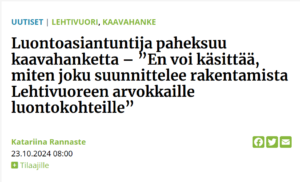 Lehtivuoren alueen luonnonvarainen metsään on kunta kaavoittamassa 1500 asukaan kaupunkimaista asuinaluetta. Ryhdyin puolustamaan lähiluontoja ja kokosin keväällä 2024 Lehtivuoren pelastamiseksi yli 400 allekirjoittajan adressin, joka toimitettiin Lempäälän kunnan luottamushenkilöille.